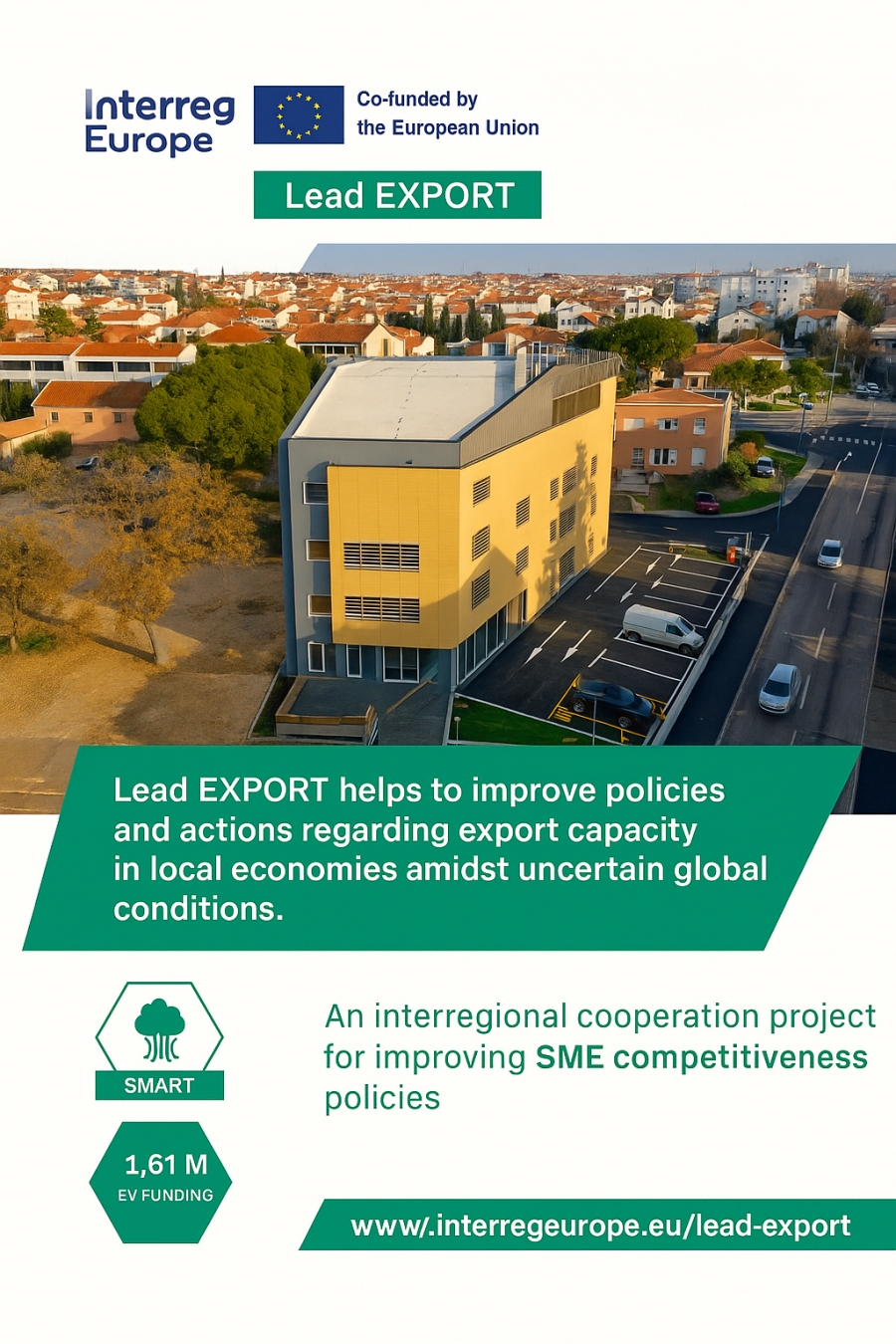 Projekt Lead EXPORT – „New approach to unleashing export capabilities in a local economy amidst uncertain conditions“ provodi se u okviru Interreg Europe programa i traje od 1. svibnja 2025. do 31. srpnja 2029. godine. U njemu sudjeluju partneri iz devet europskih zemalja – Poljske, Mađarske, Danske, Grčke, Srbije, Ukrajine, Italije, Irske i Hrvatske.