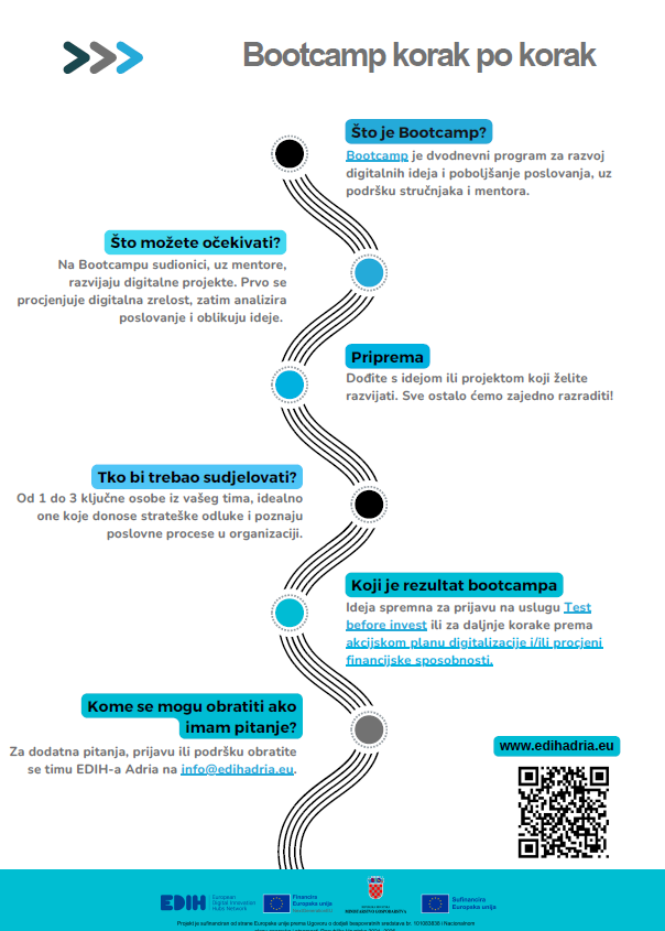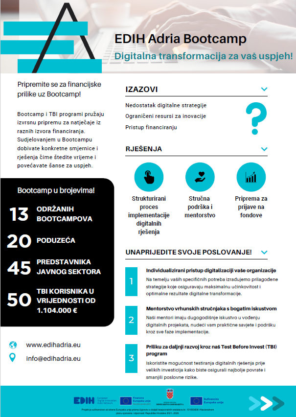 Bootcamp, dvodnevni intenzivni program, namijenjen je malim i srednjim poduzećima koja žele razviti vlastita digitalna rješenja, unaprijediti poslovanje i potaknuti inovacije uz podršku stručnog mentoriranja i razvojnog savjetovanja. Sudionici će raditi u grupama i analizirati svoje poslovne potrebe kako bi definirali potencijalne projekte za digitalnu transformaciju i inovacijski razvoj. Sudionicima će mentorirati i pružati stručnu podršku članovi konzorcija EDIH Adria, uključujući priznate stručnjake iz tehnološkog sektora, zaposlenike Infobipa i Ericssona te istraživače i znanstvenike.
